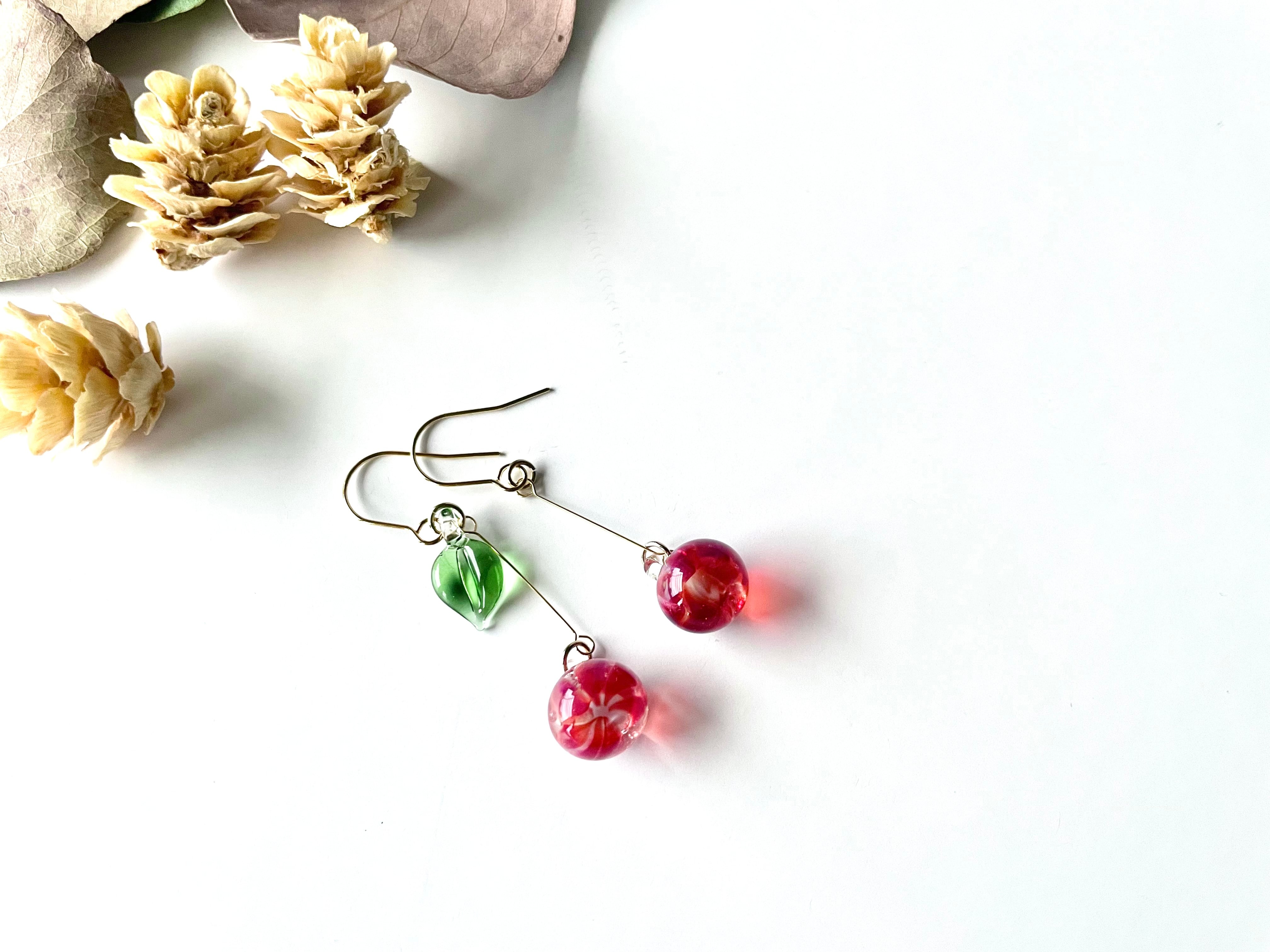 鮮やかだけれどとても微妙で味わい深い赤色のサクランボモチーフの耳飾り。